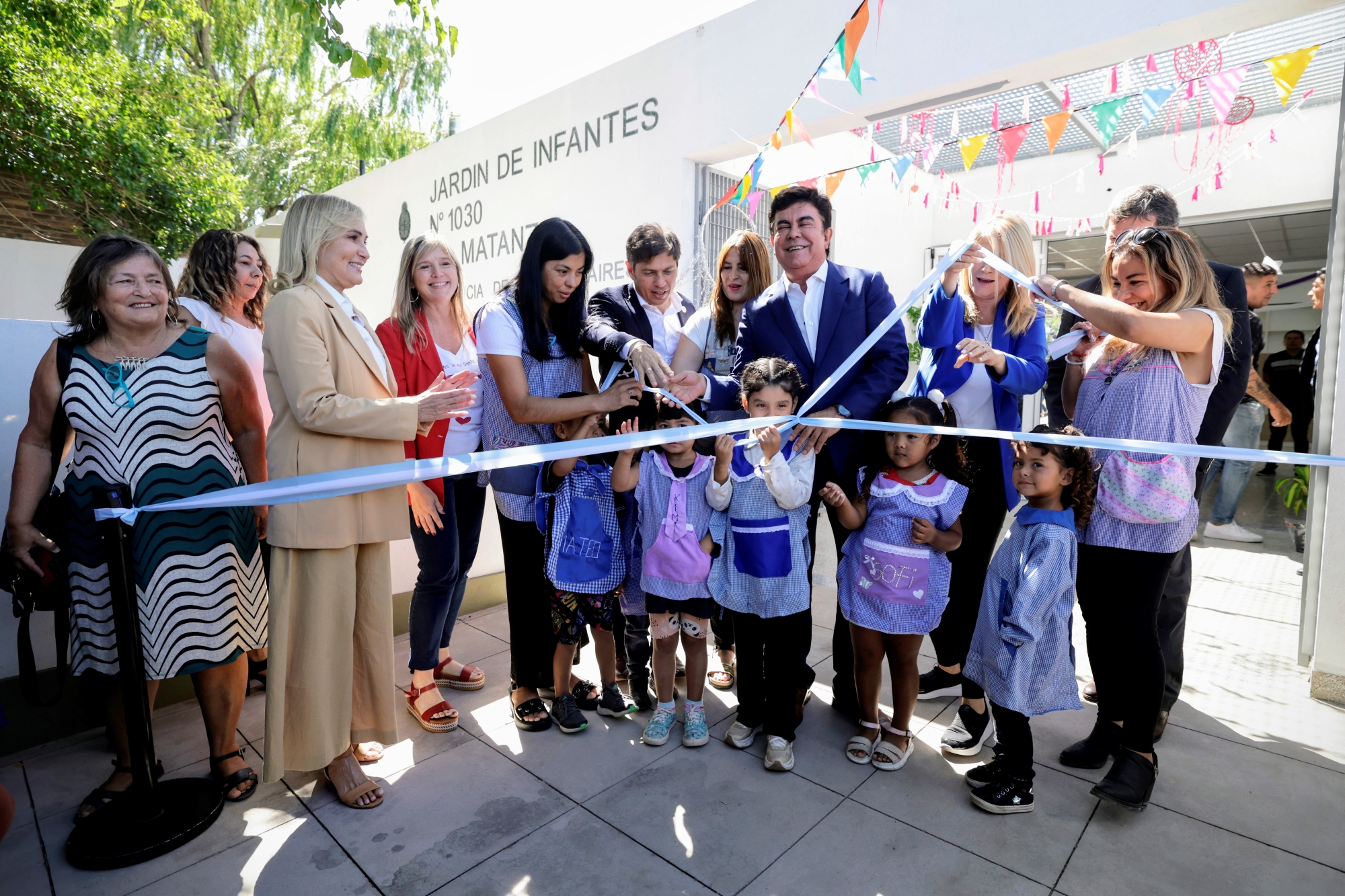 El gobernador de la provincia de Buenos Aires, Axel Kicillof, encabezó este miércoles el acto de inauguración del Jardín de Infantes N° 1.030 en el municipio de La Matanza, junto a la vicegobernadora Verónica Magario; el director general de Cultura y Educación, Alberto Sileoni; el intendente Fernando Espinoza; la secretaria de Políticas Educativas local, Silvina Gvirtz y la directora de la institución, Karina Godoy.